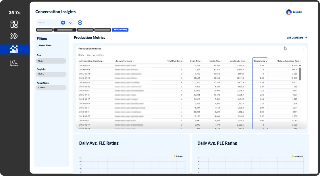 A new Concurrency metric in the agent training report tracks the number of chats an agent handles simultaneously, giving supervisors a clear view of multitasking performance. This insight helps trainers balance efficiency with quality—starting agents on single chats and gradually increasing load as they progress. Along with supporting metrics like login time, handle time, and availability, it enables supervisors to monitor progress, optimize training, and ensure agents are fully prepared for real-world workloads.
